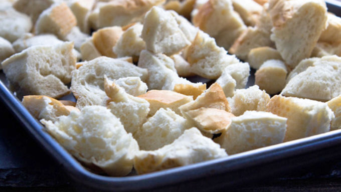 Step1Preheat oven to 225°F. Cut baked Pillsbury™ French Bread loaves into 3/4-inch cubes. and spread on a clean baking sheet. Bake 30-40 minutes, or until bread is dried out and crisp.