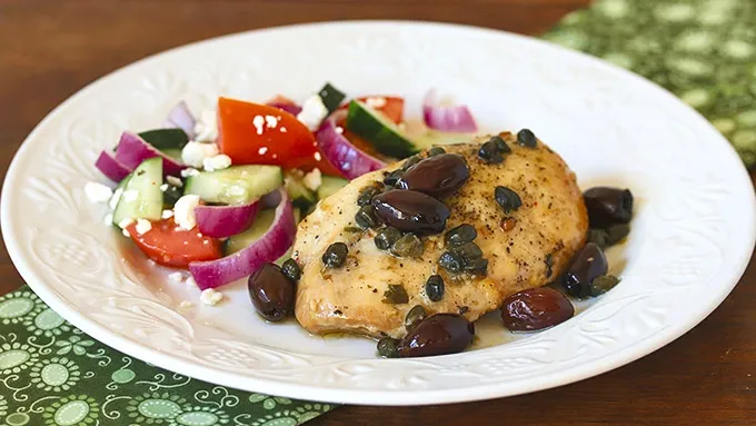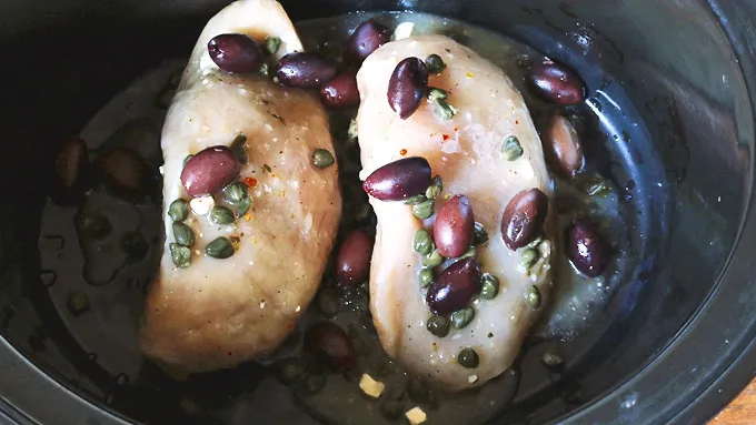 Step1Place the chicken in the slow cooker and sprinkle with the salt and pepper. Add the olives and capers and pour the Greek salad dressing over. Cook on LOW for 6-8 hours or HIGH for 4-5 hours.
