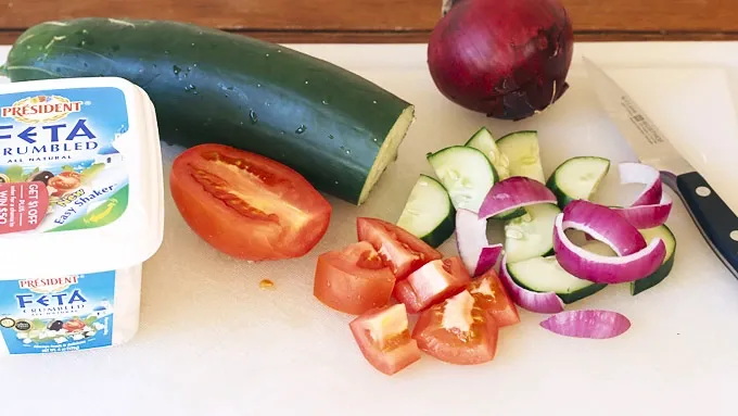 Step2To make the Greek Salad: Combine the vegetables in a bowl and toss with the Greek dressing. Serve sprinkled with the Feta cheese.