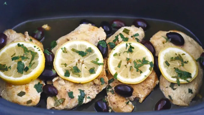 Step3Transfer chicken and pan juices to slow cooker and add minced garlic, white wine, lemon juice, salt and chicken broth. Cook on low for 5-6 hours. In the last hour add the olives and lay lemon slices and parsley on top of each chicken breast. Cook for 1 hour more.