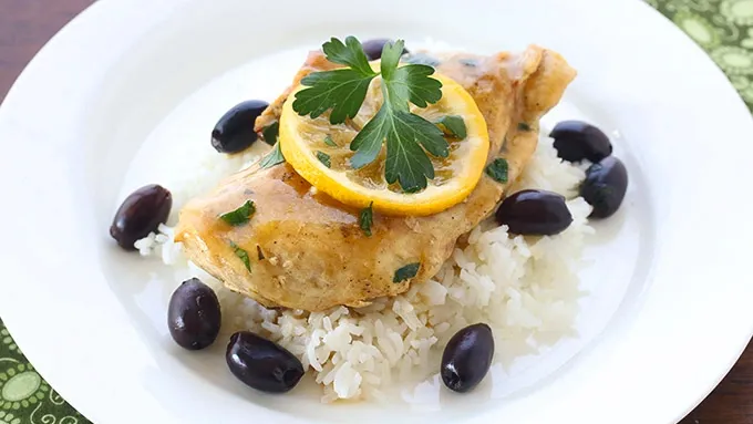 An easy recipe for tender chicken breasts infused with a delicious lemon-garlic-wine sauce and topped with Kalamata olives.