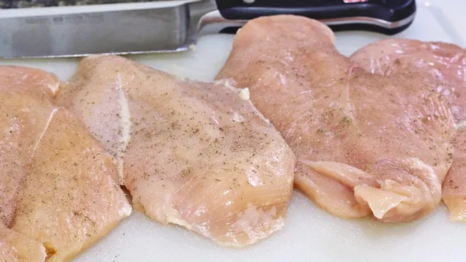 Step1Cut the chicken breasts lengthwise to make 2 thinner filets from each breast. (If you prefer thicker chicken breasts you can leave them whole and proceed as the recipe instructs.) Sprinkle each side with some salt and pepper.