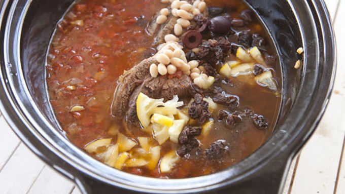 Step7Add beans, olives, raisins, and 1/2 of the preserved lemons to the slow cooker. Stir together and continue to cook for another hour or two until lamb is very tender.