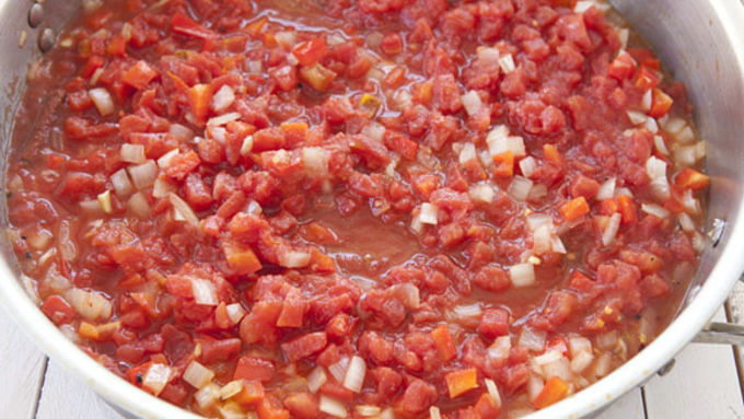 Step4Add diced tomatoes, garlic, and spices to the pan. Continue to stir and scrape up any bits.