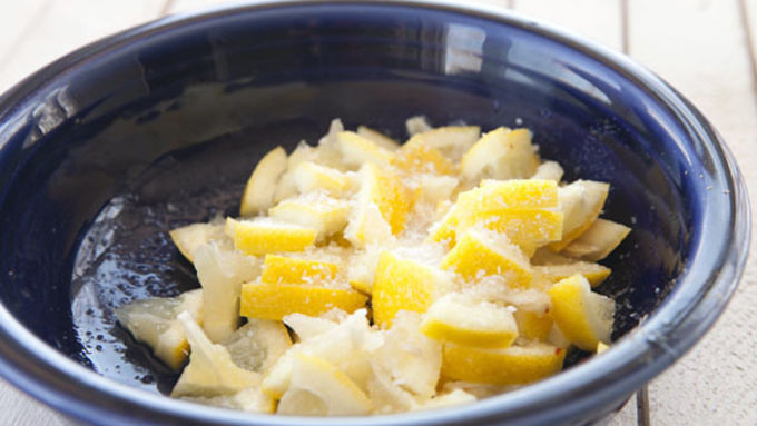 Step6While the shanks cook slowly, chop up a lemon and season it with salt and sugar. This is sort of a quick way to make preserved lemons.