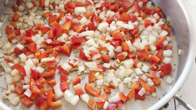 Step3Remove lamb and add onions and peppers to the hot pan. Cook for a few minutes, stirring regularly. Try to scrape up any bits stuck to the pan.