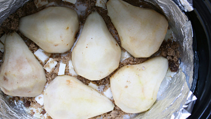 Step2Turn the slow cooker on low, or the 8 hours mark. Sprinkle in the bottom cubed butter, brown sugar and 1/4 cup granulated sugar. Place pears cut-side down evenly on top of the butter and sugar.