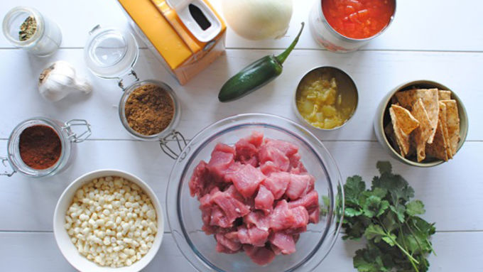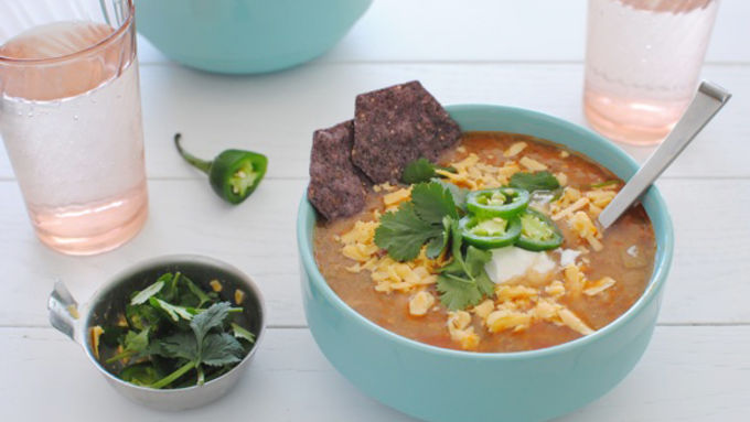 - Let's talk about the slow cooker. Everyone agrees. We all love it. It's our BFF. It saves the day. All that. And it's true! So I guess we don't really need to talk about it then, huh? In that case, let's talk about what we could put IN the slow cooker that will make ya beam. See stars. Fall in lurve. Reach for new dreams. All that. Well, A: It's a Mexican-style soup. B: With pork C: And veggies. And tortilla chips. D: And a LOT of peppery hotness that make your face rain. In the good way. E: I don't have an E, actually. Want me to just start? Okay. After about four hours of falling in love, this is what ya get! A yummy, spicy soup dolloped with cheese and sour cream and cilantro and more jalapenos. Ugh, so good. And very spicy, so watch yourself!