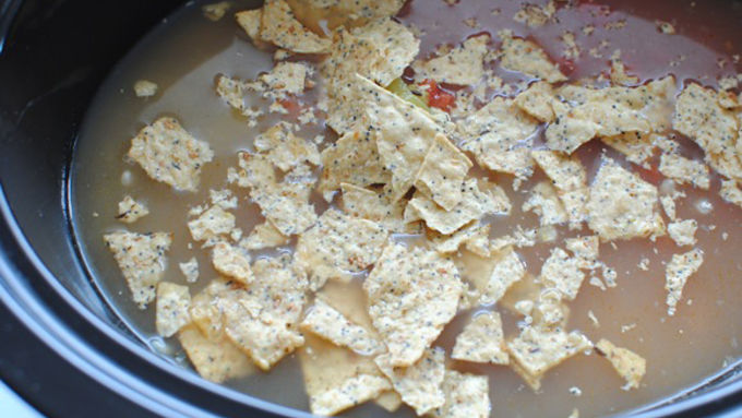 Step3Transfer onion mixture and pork to a slow cooker. Add the tomatoes through the tortilla chips. Toss in a small pinch of salt and pepper. Cook on high for 4 hours.