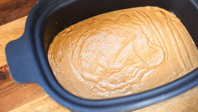 Step2Spray the crock of a 6-quart slow cooker with non-stick spray. Add the cake batter to the slow cooker and cover.