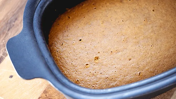Step3Cook on low heat for 2 hours or until the cake has pulled away from the sides and a butter knife comes out clean when inserted in the center.