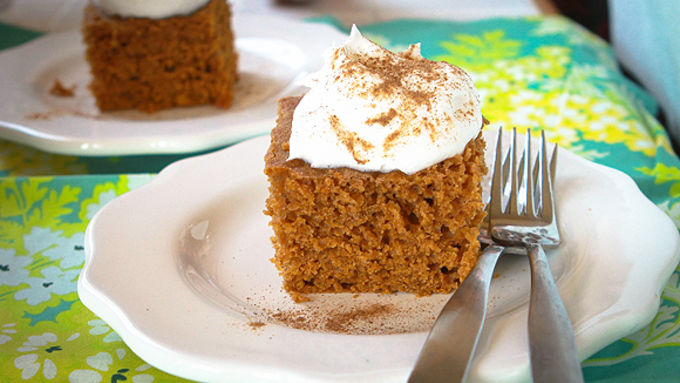 Step4Serve cake with dollops of whipped topping. Sprinkle with pumpkin pie spice, if desired.