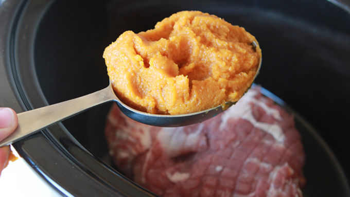 Step1Place pork roast in a slow cooker. Add the pumpkin puree, brown sugar, apple cider vinegar, pumpkin pie spice, salt, Worcestershire sauce, and maple extract. Use a spatula to mix together the pumpkin mixture over the top of the pork. Cover and set slow cooker to high. Cook for 4-6 hours, or pork is tender.