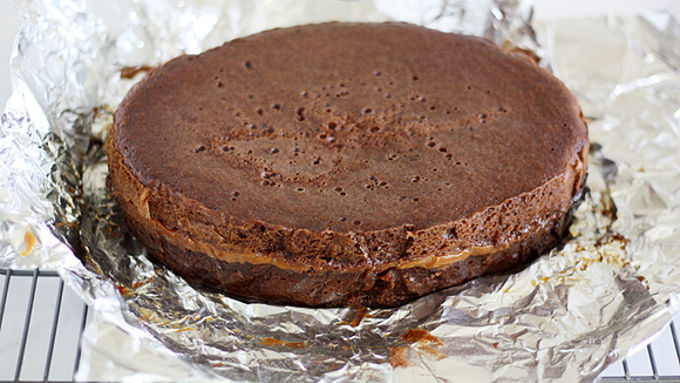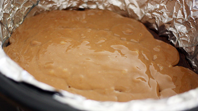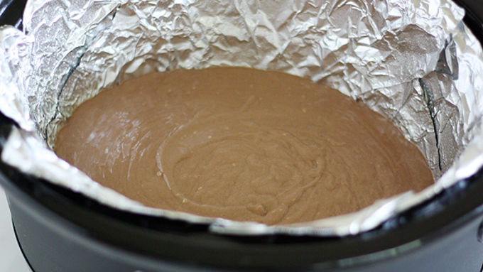 Step3Pour half of the cake batter into the bottom of prepared slow cooker. Cover and turn on HIGH. Bake 1 1/2 hours or until cake is just set.![]()