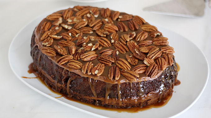 Step8Frost the top of fully cooled cake, then drizzle caramel sauce on top. Sprinkle top with pecans.![]()