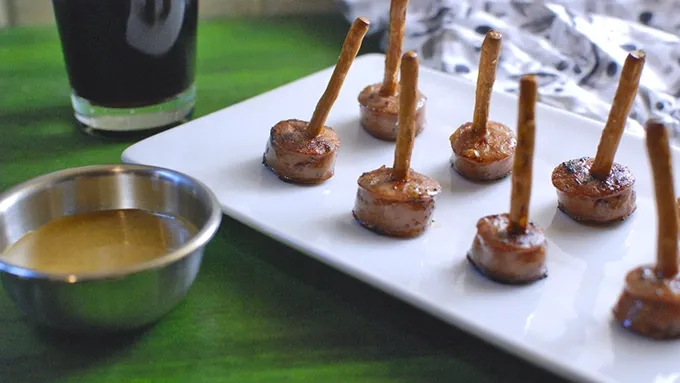 - This appetizer is entirely edible and served with a sweet and savory Guinness mustard sauce. Anytime a vessel or serving utensil is replaced with food I consider it a huge party win. Edible bowls and cups are great, but I had never considered the edible toothpick before! Using pretzel sticks works great when you're serving something that goes perfectly with pretzels, like this smoked turkey sausage. Making a quick stout mustard for dipping is what really brought this simple party app from good to great. The sweet and savory dipping sauce complimented both the pretzels and the sausage and had that nice creamy flavor from the dark beer. This is a fancy-looking app that's really easy to make and will please a crowd! Smokey, sweet, salty, and tangy – just what you want in one bite of food.