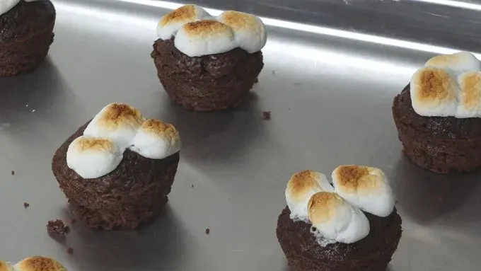 Step5Remove brownies from pan by running a knife around the edges of each brownie. Place brownies on cookie sheet and top each with 3 mini marshmallows.