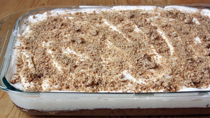 Dense milk chocolate cake topped with marshmallow pudding, cool whipped topping and crumbled Nature Valley granola bars. Tastes just like a s'more!
