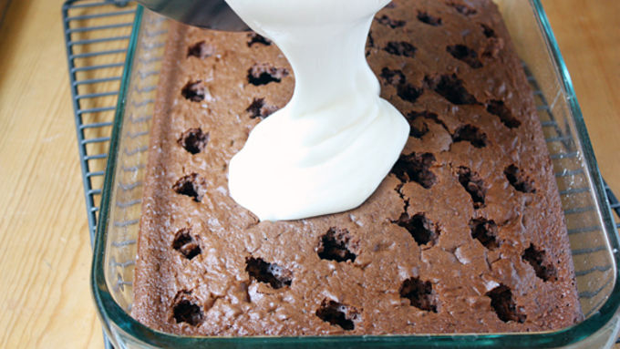 Using the handle of a wooden spoon or spatula, poke holes in cake about every 1/2 inch. Pour marshmallow topping evenly over cake. Cover tightly with plastic wrap and chill 2 hours in refrigerator to set.