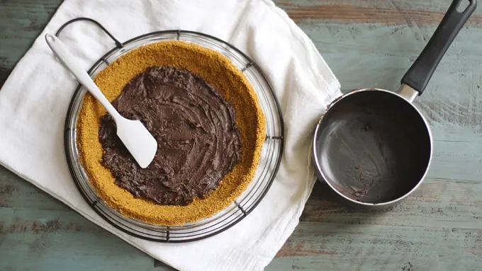 Meanwhile, make the fudge layer. In a small saucepan over low heat, stir chocolate chips and heavy cream until melted and smooth. Quickly pour and spread mixture into the bottom of the cooled crust.