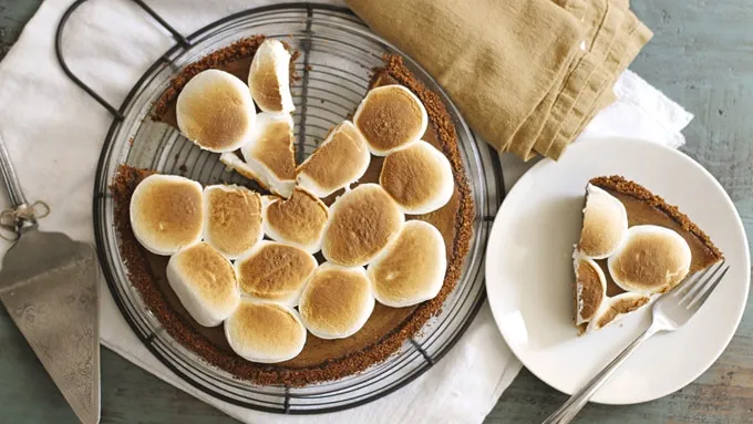 S'mores are hard to resist – especially in pumpkin pie form! This chocolate fudge pumpkin pie with marshmallows twists up tradition in a delicious way.