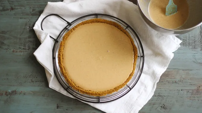 Pour pumpkin batter on top of fudge layer. (Be careful not to overfill the pie plate; you may not use all the filling.) Bake 1 hour until pumpkin pie layer is just set in the center. Cool completely on a cooling rack, then cover tightly with plastic wrap (making sure it doesn’t touch the top of the pie) and chill at least 2 hours, preferably overnight.