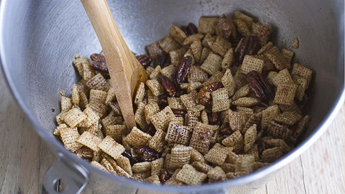 Step5In a large bowl toss together the cereals, melted stick of butter, vanilla and 1-2 teaspoons of the remaining cinnamon sugar from earlier. Toss well and then spread out between two cookie sheets. Bake for 15 minutes at 300°F, stirring once or twice during cooking. Remove and allow to cool. Once cool, add the cereal, snickerdoodles and pecans to a large bowl and toss well. Serve.