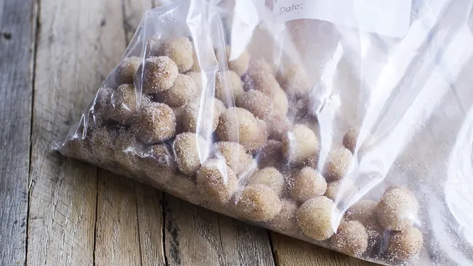 Step2Sprinkle flour onto work surface; knead flour into cookie dough. (DO NOT EAT RAW COOKIE DOUGH AFTER COMBINING WITH FLOUR.) Tear off teaspoon-sized balls of dough and roll between your hands to create a smooth ball. Add all but 2 teaspoons of the cinnamon sugar to a gallon-sized zip-top bag. Reserve the remaining 2 teaspoons of cinnamon sugar for later. Add the cookie balls to the bag and seal it. Gently toss the balls with the cinnamon sugar until all the cookie balls are coated.