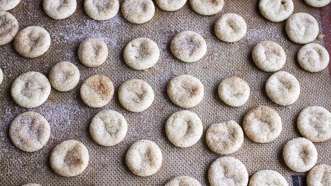 Step3Place the cookie balls 1 inch apart on a parchment-lined cookie sheet. Bake five minutes or until set. Remove and allow to cool. Reduce oven temp to 300°F.