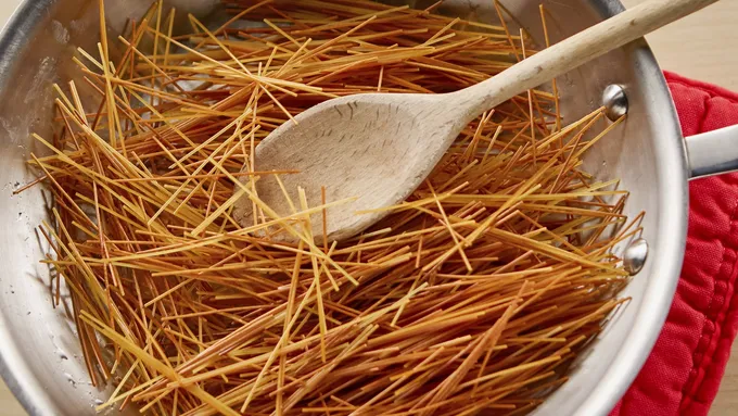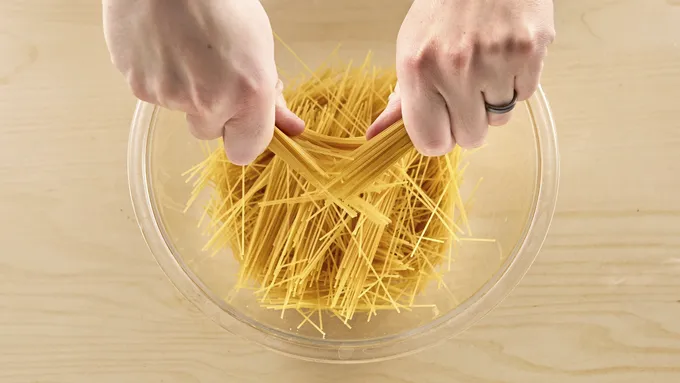 Step1Put the pasta into a large bowl and break it up with your hands into 2 to 3-inch pieces.