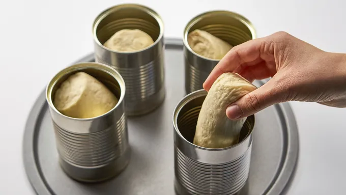 Step2Cut each loaf of refrigerated French bread in half (so you have 4 pieces total). Place one half upright inside each soup can.
