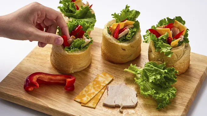 Step5Mix avocado and salt and pepper; spread along the inside bottom and sides of each bread cavity. Fill with cheese, turkey, lettuce and red bell pepper slices. Serve!