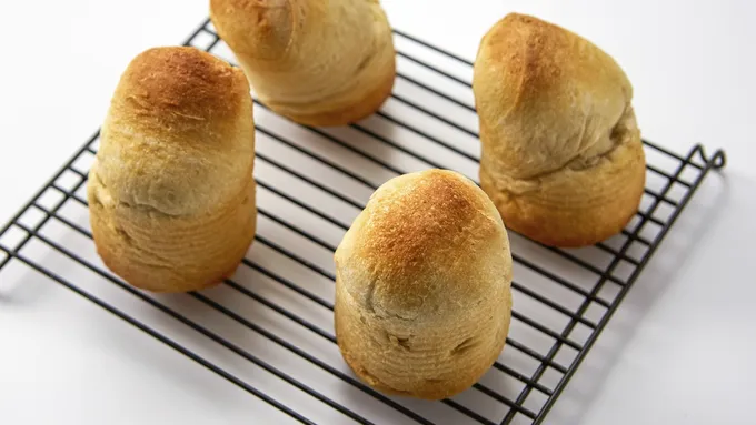 Step3Bake 20 to 25 minutes until bread is baked through and dark golden brown on top. Remove bread from cans; if it seems doughy, return to baking sheet (out of cans) and bake another 5 minutes. Cool bread completely on a cooling rack.