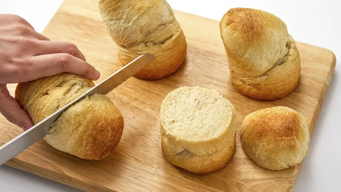 Step4Slice the domed top off each piece of bread. Use your fingers to remove the middle of the bread. Use your fingers to push the bread to the edges so you end up with a hollow cavity (use extra bread to dip in the soup from the soup cans).