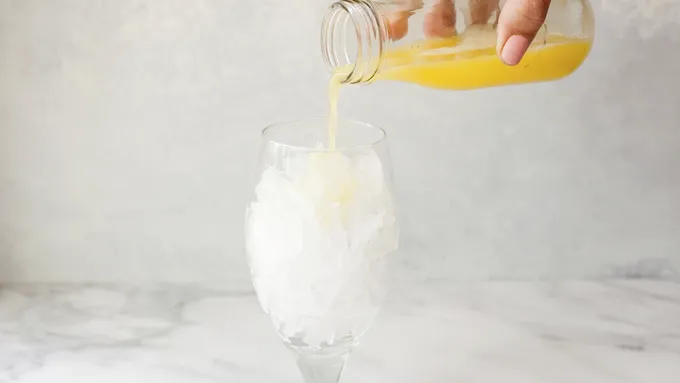 Step1Fill a hurricane glass with ice. Pour pineapple juice over top.