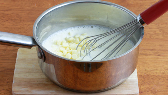 Step2Pour in the white chocolate chips and whisk until they're melted and thoroughly combined. Whisk in the vanilla extract.