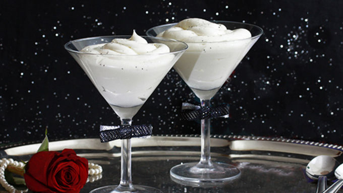 - Whether you’re throwing a casual New Year’s Eve party with your friends or hosting something a little more formal and elegant, these sparkly dessert glasses will be a guaranteed hit. Deliciously creamy white chocolate mousse is piped into ribbon-tied martini glasses and sprinkled with edible glitter. They’re the perfect addition to a magical evening! These ritzy, decadent desserts are not only incredibly easy to make, they can be made several hours ahead and kept chilled until ready to serve. You can use either standard-sized martini glasses (the recipe will fill about 12 glasses, depending on how full you pipe them) or use 24 mini martini glasses. Either way, they’re perfect if you want an elegant and hassle-free dessert. I must warn you, this mousse is dangerous. I found myself tasting it at almost every stage of preparation…and more than once per stage. It’s reeeeeally hard to stop after one taste. Trust me, I know. I mean, it’s pure cream, chocolate, and sugar…who could resist such a combination? And it’s also a good thing that each serving is limited to just a glassful. You don’t want you or your guests ringing in the New Year with an extra ten pounds to haul around, know what I mean? I’m just forewarning you in advance so that you can strengthen your willpower to resist eating all the mousse before your guests arrive. (No, I didn’t eat ALL the mousse…some of did make it to the martini glasses. See? There are two glasses in the picture. Sheesh. I’m not that bad.) New Year’s Eve was made to sparkle and these shimmering little jewels are just what the party calls for. They’re classy with the perfect touch of pizzazz. Happy New Year!