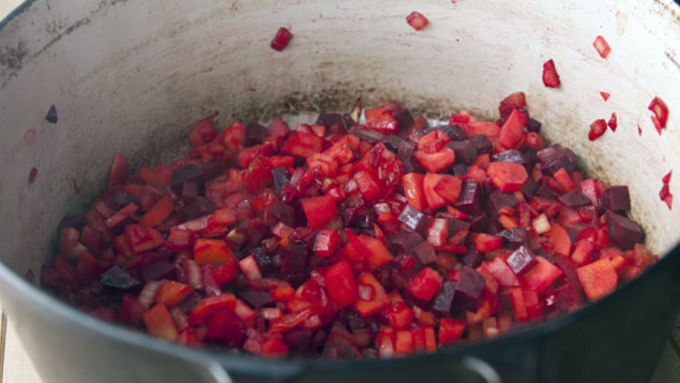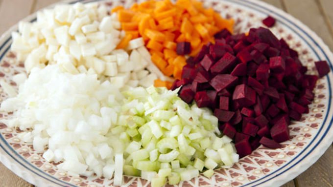 Step1Peel and dice the onions, carrots, celery, parsnips, and beets so they are all roughly in a 1/4 inch dice.