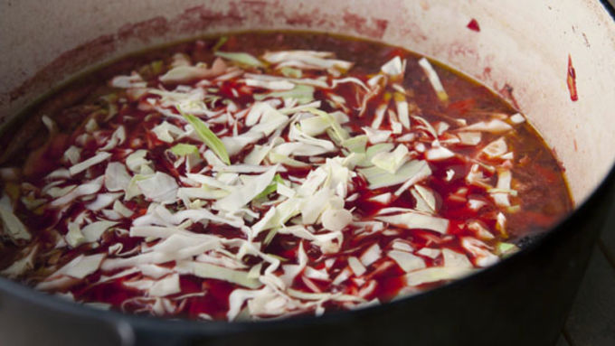 Step4Add in sliced cabbage to the soup and continue to simmer until it softens.