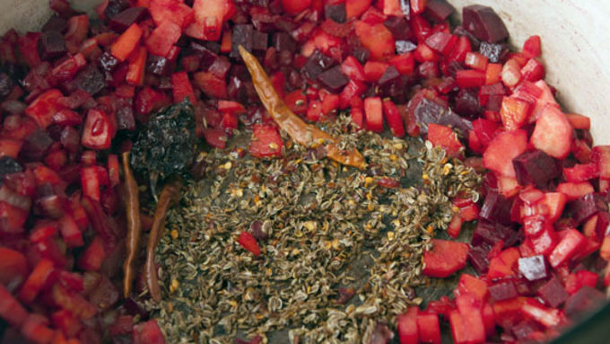 Step3Make a well in the center of the pot and add a small drizzle of extra oil if the pan is really dry. Add all your spices and cook for 30 seconds. If you want the soup VERY spicy, add the dried habanero. Otherwise, leave it out. Add water and bring to a simmer. Cover and simmer the soup for 8-10 minutes until veggies are tender.