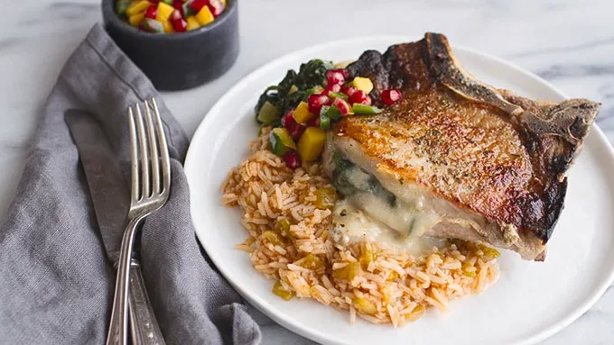 - Need a quick on-the-go dinner? You got it. So how do you feel about pork chops? Up until a couple weeks ago, I had never cooked with pork CHOPS. I know, I know – and I call myself a food blogger? Yeah. I cook with pork all the time, but chops have never been in my repertoire. So a couple of weeks ago the thought occurred to me that I should probably try my hand at a simple pork chop recipe. My mind swayed towards a seared Mexican, cheesy chop. How could you ever go wrong with a cheesy chop? The verdict? Seared pork chops are the best – a super quick and easy dinner. I love these! Of course, it helps that each chop gets generously stuffed with a little pepper jack cheese and sautéed spinach. SO good. Feel free to use your favorite cheese: Cheddar, smoked gouda and even a blue cheese would all be awesome. I served my chops with some Old El Paso Spanish Rice and quick mango-pomegranate salsa to finish things off. It was the perfect 30-minute meal. Especially perfect for this holiday season (the busiest time of the year)!