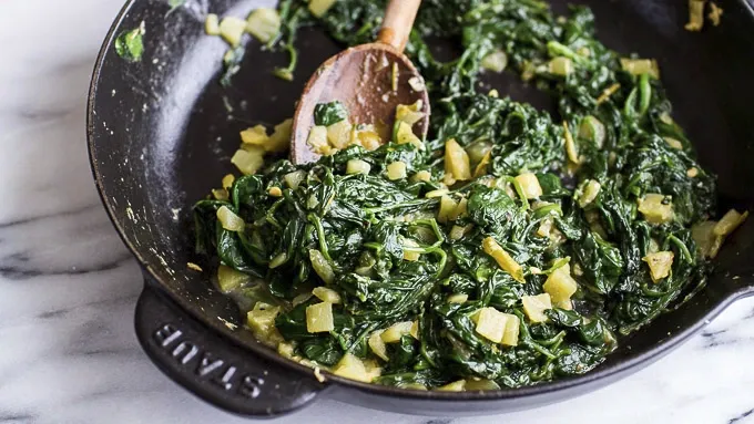 Step3Meanwhile, heat a large skillet over medium heat and add 2 tablespoons olive oil. Add the garlic and cook 30 seconds to 1 minute, then toss in the fresh spinach. It will seem like a lot of spinach, but as it cooks it will shrink down. Lower the heat, cover and cook 3-5 minutes or until the spinach is wilted. Stir in the Old El Paso chopped green chilies and a pinch of salt and pepper. Continue to cook uncovered for a minute or two and then remove the spinach from the skillet.