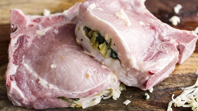 Step4Remove the pork chops from the brine and pat dry. Stuff about 1/4 cup of cheese into the pocket of each pork chop, then stuff with the spinach mixture. Brush the pork chops with olive oil, sprinkle with the oregano and season with salt and pepper.