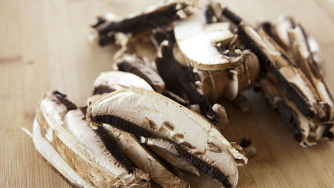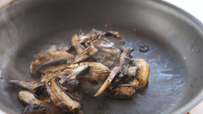 Step6In a large skillet, heat a few tablespoons of olive oil over medium high heat. Add mushroom slices and cook until the mushrooms start to lose their liquid. Add soy sauce to mushrooms and cook until soft, about 5-6 minutes total.