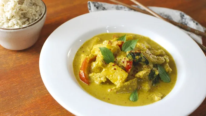 A Thai yellow curry recipe for chicken, jazzed up with pineapple and basil.