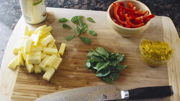 Step2Cut the pineapple, chicken and the red pepper into strips. Remove the basil from the stalks and tear the larger leaves.