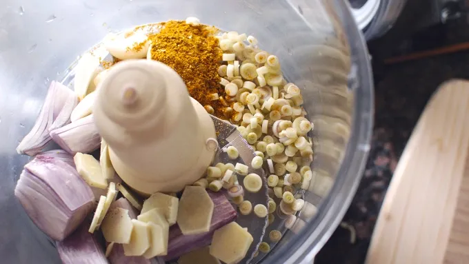 Step1Remove the stringy outer pieces of lemongrass and slice the tender lemongrass heart into small rounds. Place all the curry paste ingredients into the food processor and process until smooth.