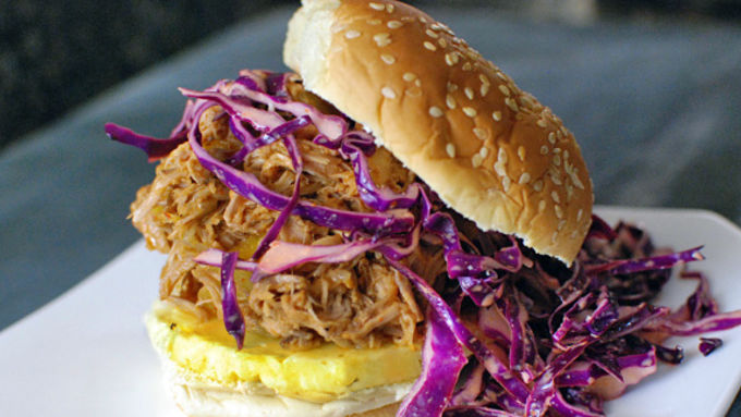 Step4Build the sandwich. First put a pineapple ring on the bottom half of the bun, then pile on the pulled pork and top with the slaw. Serve with the extra BBQ and sriracha sauces on the side.
