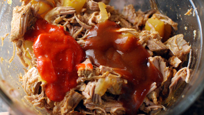 Step2Remove the pork from the slow cooker and shred. Add a few big spoonfuls of the cooking liquid, then mix in the additional BBQ sauce and sriracha.