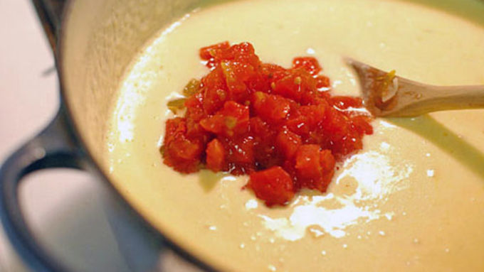 Step4To make the sauce: shred all the cheese first. Melt the butter in a medium pot. Add the diced onion and cook 5 minutes. Add the flour and let it cook for 3 minutes stirring constantly. Whisk in the milk and bring to a simmer. Slowly stir in the cheeses until everything is melted and a nice cheesy consistency. Strain the tomatoes and add them in last.